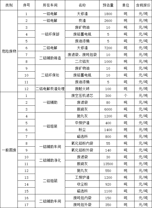 萬基控股集團(tuán)招標(biāo)辦近期將對(duì)河南萬基鋁業(yè)股份有限公司的危廢(十二項(xiàng));大修渣、二次鋁灰、炭渣等;一般固廢(十七項(xiàng));噸包袋、中頻爐渣、磁選料等物料進(jìn)行銷售招標(biāo)(下附清單),業(yè)主單位不對(duì)該物資的質(zhì)量、用途等做任何承諾,以現(xiàn)場標(biāo)的物現(xiàn)狀為準(zhǔn)。歡迎參與前期實(shí)物勘查。